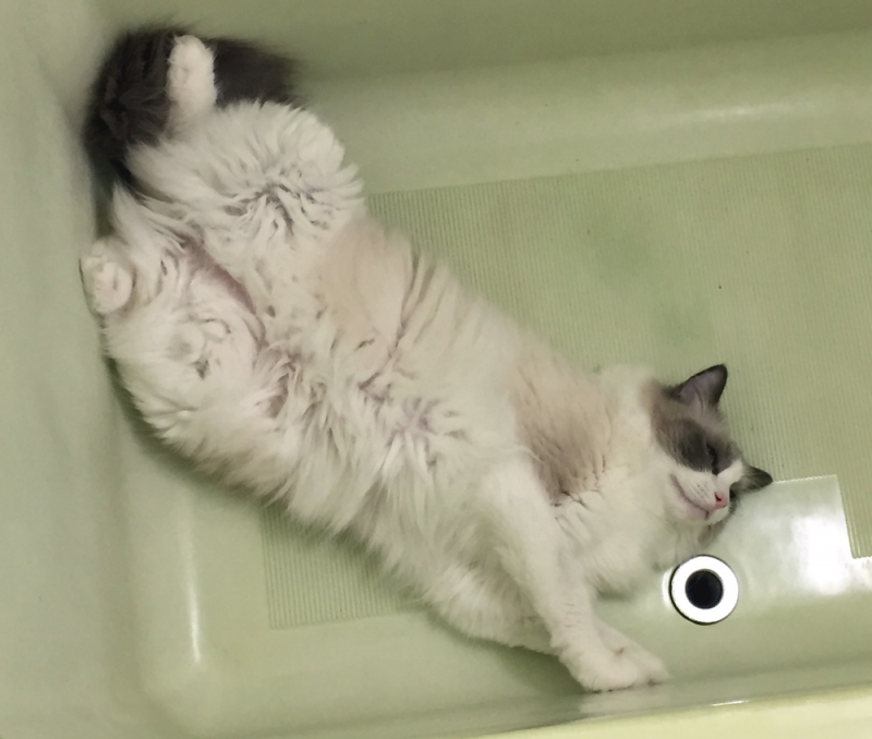 うちの猫はクーラーが嫌いで、風呂の底がお気に入りです。