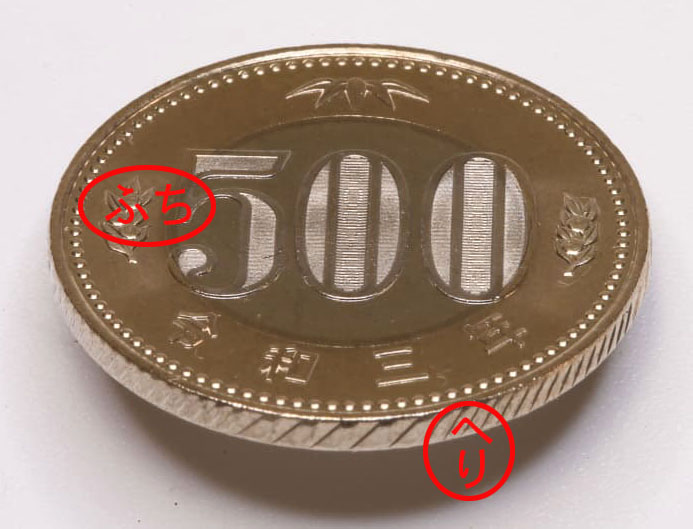 下の図の500円玉を見てください。「500円硬貨のふちが汚れている」「500円硬貨のへりが汚れている」では、汚れている場所が違います。