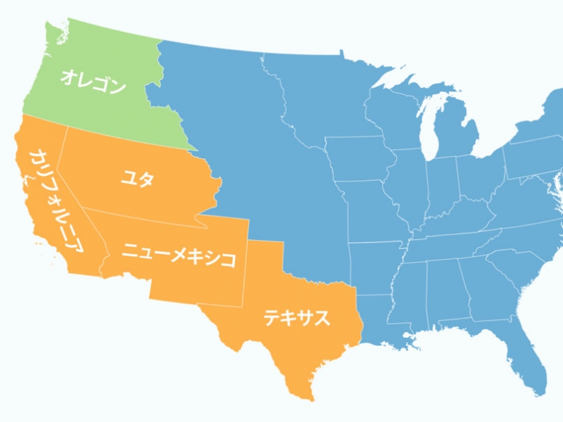それは、アメリカの西海岸、下の図のオレンジ色の部分は、元はメキシコ領だったからです。メキシコはスペインの植民地時代が長かったため、言語はスペイン語を使っています。ですから、オレンジ色の部分はスペイン語の地名が多いのです。