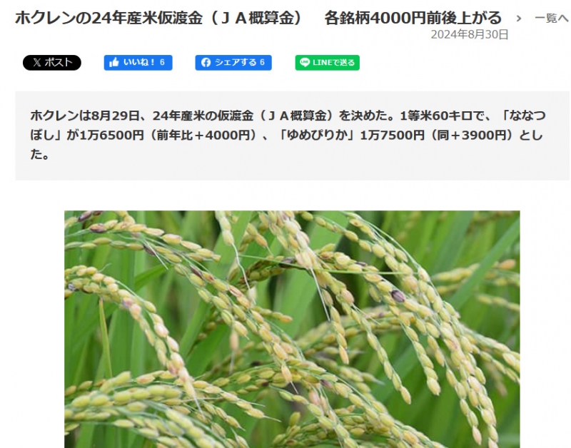 私は北海道のゆめぴりかを食べていますが、一昨年のホクレンの示した概算金は、13600円でしたので、5KGあたり1130円ほどで、流通コストと販売コストを加えた金額、2200円ほどで購入する事ができました。昨年秋の概算金は、60KGで17600円。5KGに換算すると1460円です。流通コストと販売コストが加わり、私たちが入手する金額は3000円ほどになるはずでしたが、なぜか米が不足し、5000円ぐらいになっています。