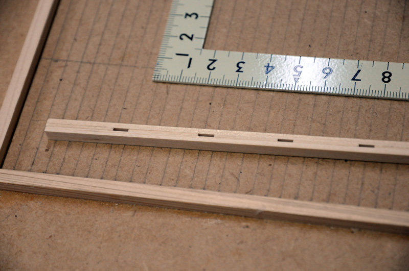 穴になる部分に5ミリ幅、1ミリ厚の板を立て、ようじの先にボンドを付けて、立てた板の間に板を挟み込んでいきます。