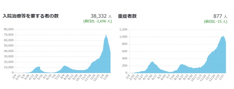 コロナの新規感染者数がどんどん減ってきていますが、3週間ほど遅れて重症者数等も減り始めました。