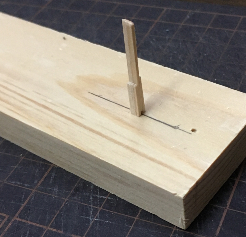 板に1.2ミリの穴を開け、ホゾの付いた芯材を立てます。その両側に10ミリと11ミリの板を接着します。