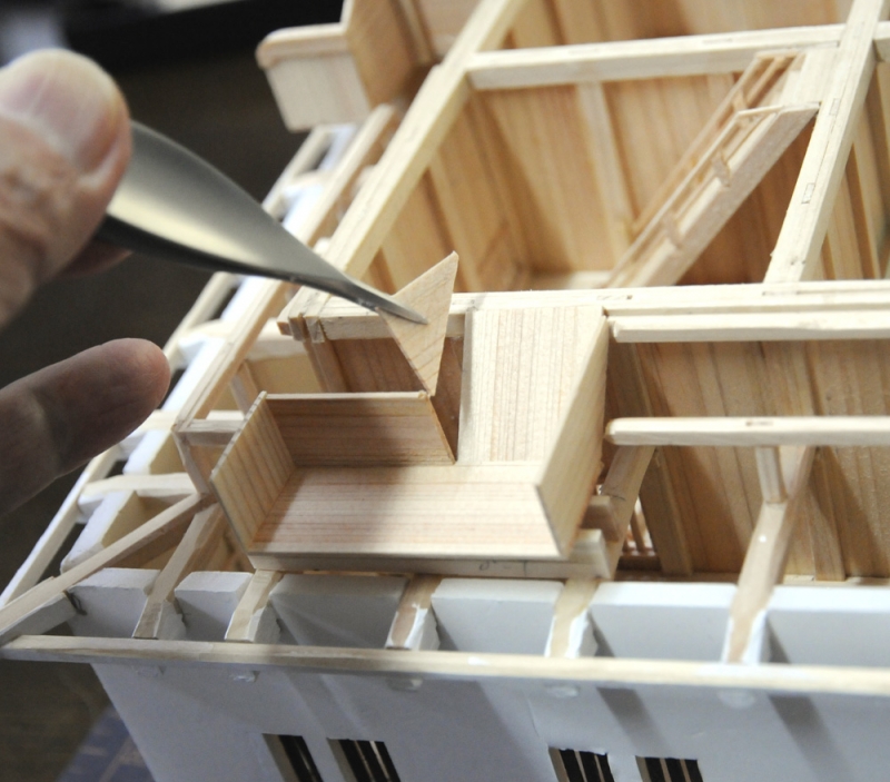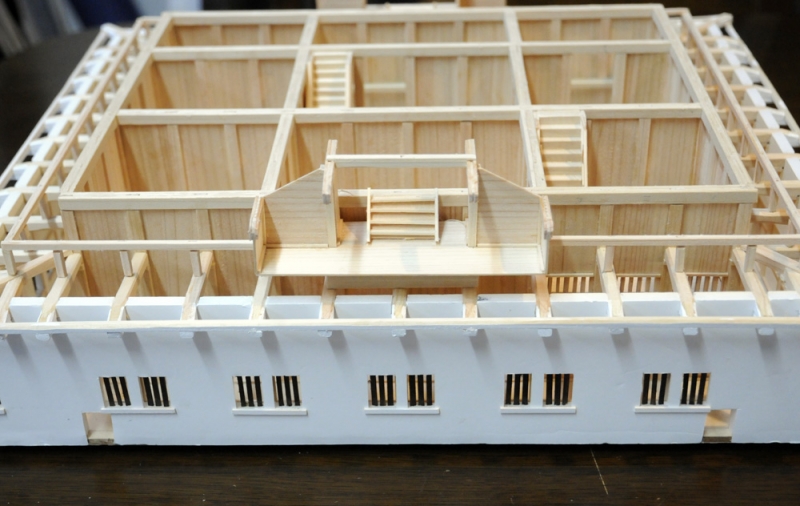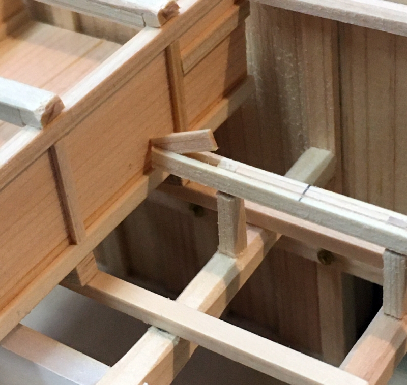 上から見た所。次は梁の上に破風の間を作っていきます。
