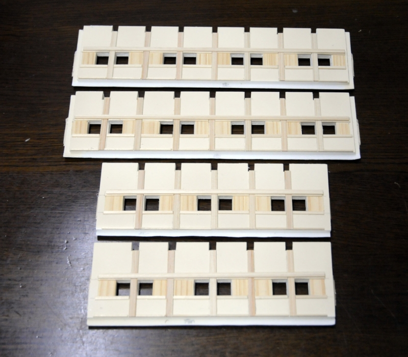 裏面に柱を貼り付け、窓の上下に桟を貼り付けます。