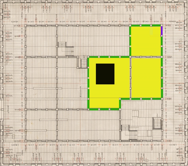 以下の黄色く塗られた部分が令和エリアです。大きな黒い穴はエレベーターシャフトです。