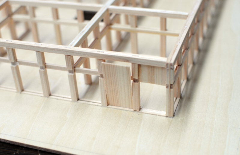 この堺以外は引き戸が無いのでホゾ穴とホゾ穴の間は1ミリ角の棒で埋められていますが、堺の部分は後で引き戸を作るために埋めてありません。