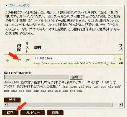 「編集」タブをクリックすると、メッセージを書き換える事もファイルの差し替えも自由にできます。 下の方の「ファイルの添付」の所をご覧ください。 「削除」と言うボックスがありますので、そこにチェックを入れ、一番下の「保存」をクリックすると、添付データが削除されます。間違っても一番下の「削除」をクリックされないように。メッセージ全体が消えてしまいますので。