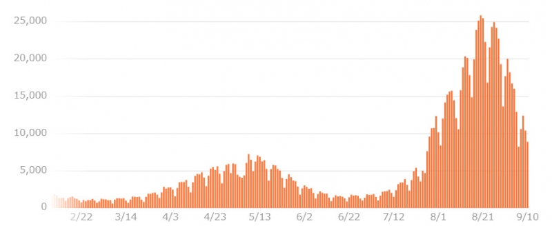 7月半ばから都市圏は緊急事態宣言を発していますが、グラフは急上昇し、特に人の行動が変わったわけでも無いのに今は収束に向かっています。