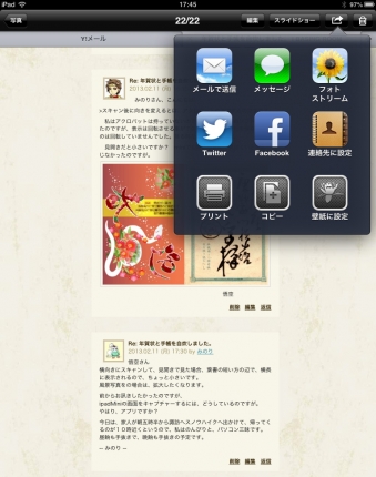 一番良かった事は、iPadを横向きにすると見開きで表示される事。1枚の年賀状の表面と裏面を同時に見る事ができます。これはかなり快適ですよ。