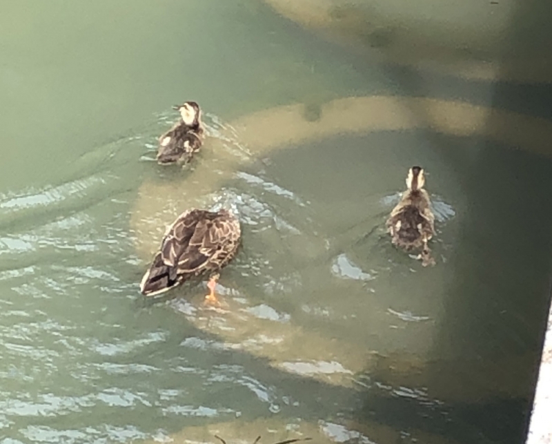 散歩の途中で見かけるカルガモの赤ちゃんがかなり大きくなりました。