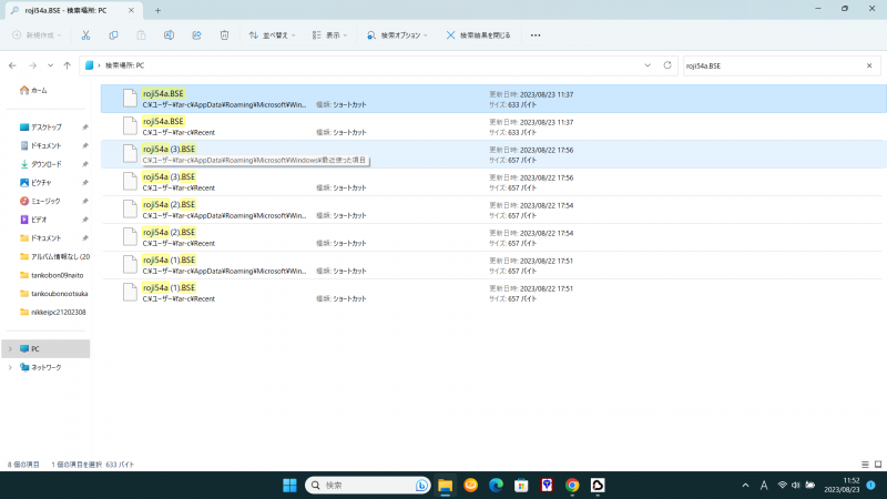 今回同様の操作をするとエクスプローラ(Windows11)のトップ画面の「最近使用した項目」のところには当該ファイルはあるのですが、実際ドキュメントの中を探しても見つけることが出来ません。右クリックして「ファイルの場所を開く」をクリックしてもドキュメントには移りますがファイルがない為指定されません。