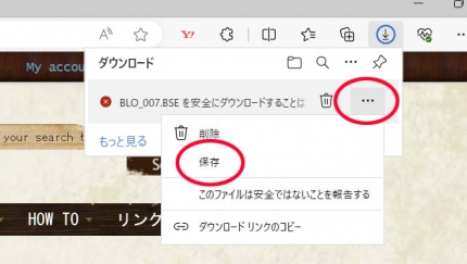 BSEデータをダウンロードしようとすると警告が出ますが、警告文の上にカーソルを持っていくと下の画面が出ます。右の方の・・・の部分をクリックして、保存を選んでください。警告は無視していただいてかまいません。