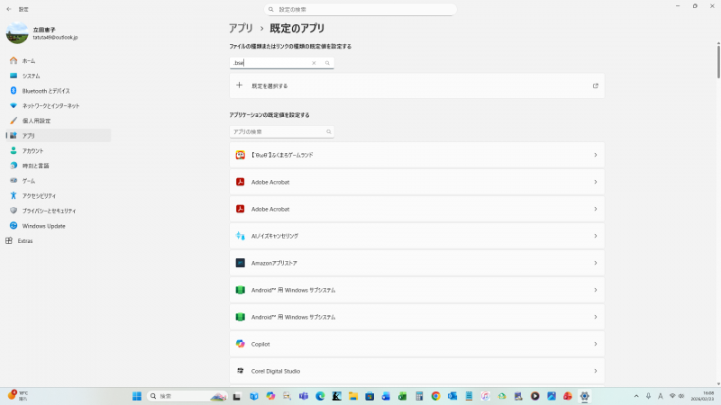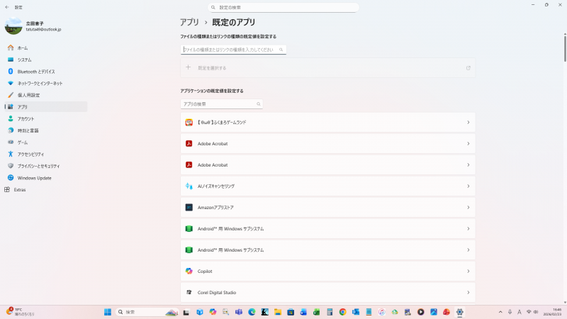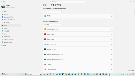 スクリーンショットの画面は、「アプリ、規定のアプリ」ですね。