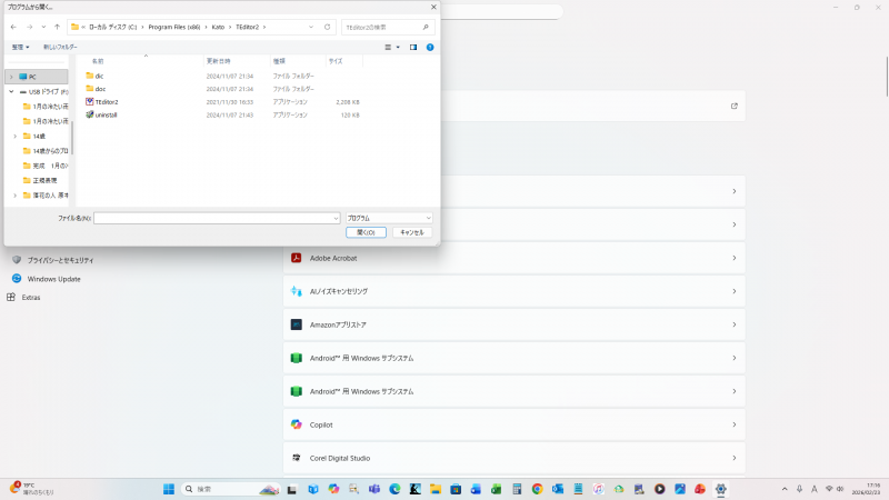「Program Filesx(x86)」の中の「Kato」をクリックし、「TEditor2」をクリックすると、TEditor2.exeが有りますから、それをクリックします。
