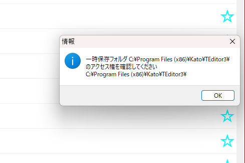 画像のエラーメッセージは 「一時フォルダ●アクセス権を確認してください●」 上記でよろしいですか?(●は読みとれず) TエディタのHPに