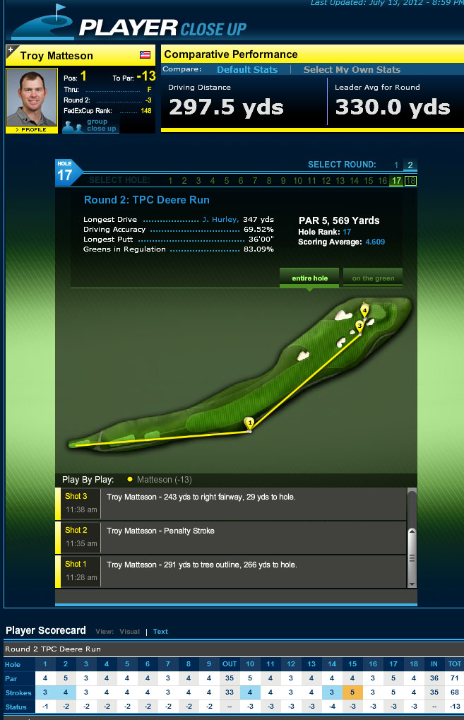 それに引き替え、PGAツアーの情報は凄いです。リーダーズボードはほぼリアルタイムで更新されるのはもちろんですが、プレーヤー個々の情報も詳しく入ってきます。ショットトラッカーでは、全プレイヤーの状況が図解入りで表示されます。1打目はどこへ打って、距離は何ヤードと言う具合に表示され、ボールの軌跡がホールの図の上に表示されます。