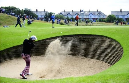 全英オープンのリンクスコースの名物は、このポットバンカー。バンカーと言うより浅い井戸と表現する方が適切か? 日本のゴルフコースではバンカーに入っても「ナイスリカバリー」が期待できますが、この井戸に入ったらそういう期待は捨てなくてはなりません。